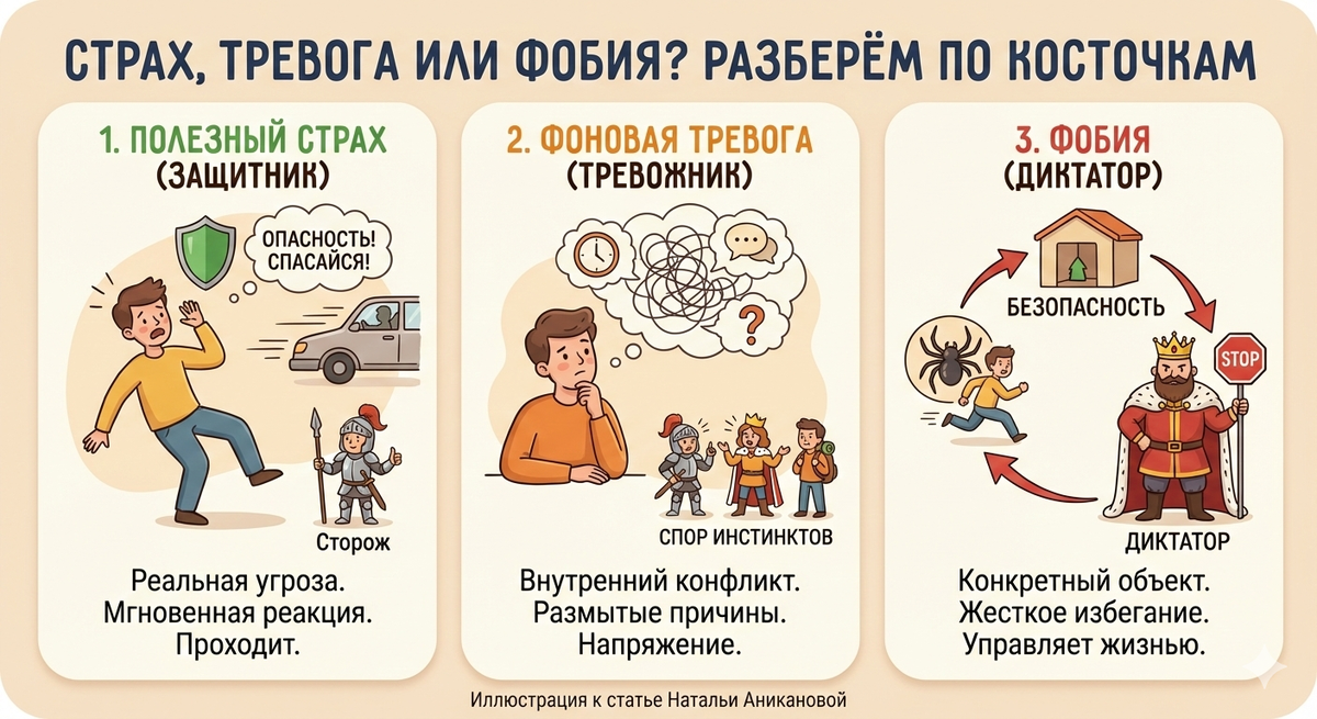 Мы часто говорим «мне страшно», «я тревожусь» или «у меня фобия», не понимая разницы. А ведь от этого зависит, как себе помочь. Давайте разберём три состояния: полезного страха-защитника, фоновой тревоги-тревожника и всепоглощающей фобии-диктатора. Узнаем, как они устроены и что с каждым делать.