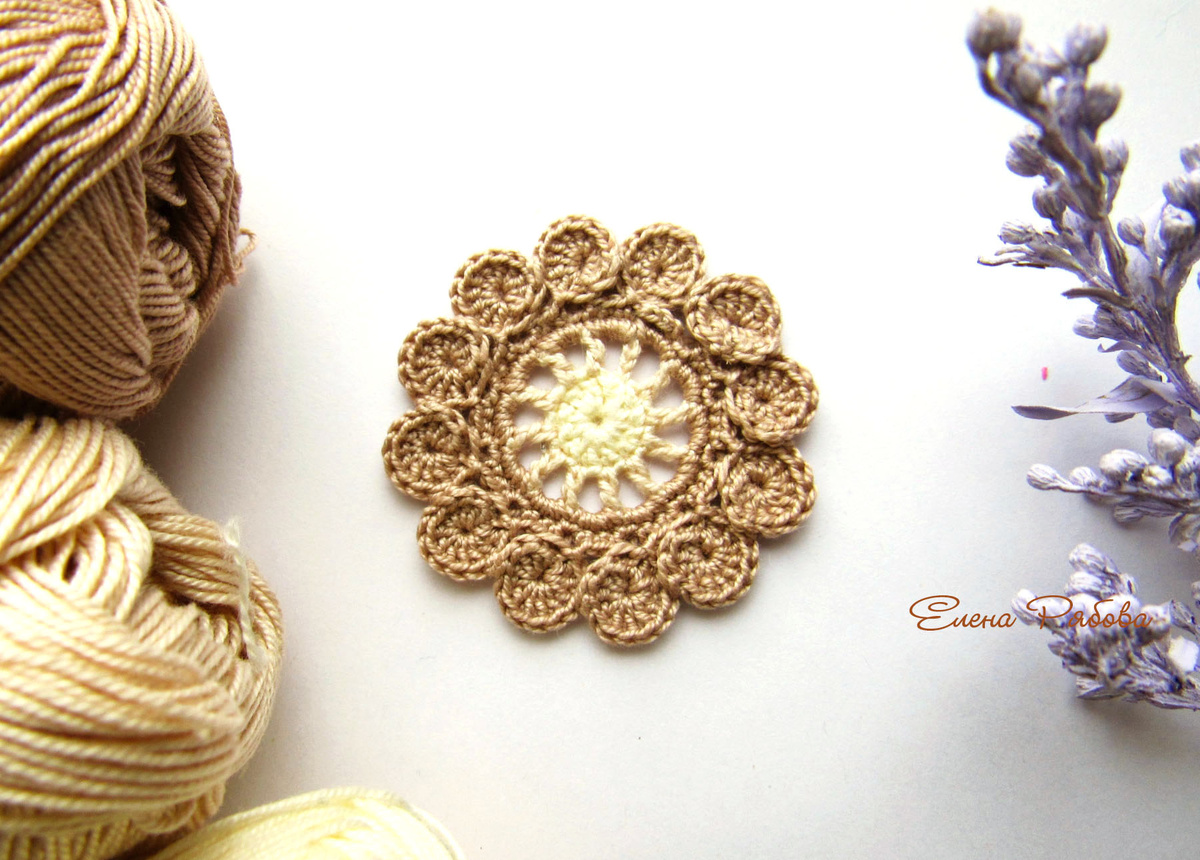 Добрый день, уважаемые подписчики и гости моего канала! Сегодня приглашаю Вас связать круглый мотив крючком. Такой элемент может быть белым или многоцветным. Может быть самостоятельным элементом или стать серединкой для многоярусного цветка. Я буду использовать его для воротничка в технике арт-кружева. Пряжа и инструменты. Цветной мотив связан крючком из пряжи "Анна 20". Толщина нити 330 метров в 50 граммах, 100% мерсеризованный хлопок. Крючок № 0.75. Белые мотивы связаны из хлопка "Ирис". Толщина нити 450 метров в 50 граммах, 100% мерсеризованный хлопок. Крючок № 0.5. Ещё нужна будет игла для зашивания хвостиков и ножницы. Приступаем к вязанию. Затягиваем стартовую петлю, набираем пять воздушных петель. Провязываем соединительный столбик в первую петлю. Набираем три воздушные петли, вяжем 11 столбиков с накидом в круг, соединительный столбик в третью воздушную петлю. Хвостик прижимаем к цепочке и обвязываем вместе с ней. Нить обрезаем, затягиваем. Хвостик зашиваем иглой в изнанку. Ни