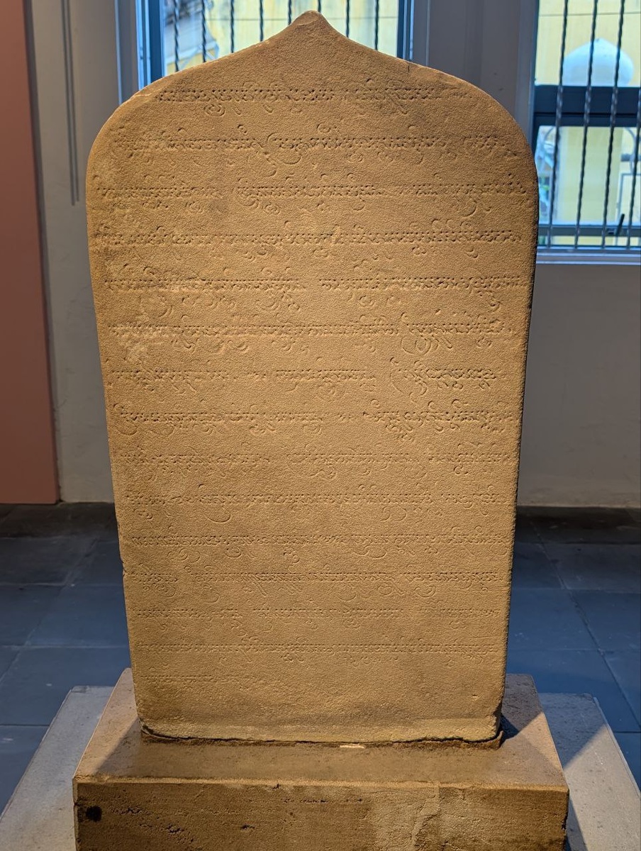 Теперь перейдем к текстам. Сохранилось несколько стелл с надписями на санскрите и старо-чамском языке. Часть из них сохранилась, часть была повреждена. Для тех, что сохранились, сотрудники музея любезно сделали транслитерацию с паллава, так что мы можем попробовать их прочитать, по крайней мере те, что на санскрите. Далее будет мой перевод этого текста. Да будет благо! Ом намах Шивайя! Да будет благо! Да пребудет благополучие! I. Тот, кого созерцают в дхьяне все боги во главе с Сурешей (Индрой), а также все добродетельные люди, познавшие Его истинную природу; самосущий, пречистый, высший, избраннейший — Он, Ишананатха, торжествует вечно! II. Даже единожды вспомнив о Нём, простёршиеся [в почтении] спасаются от бед — да пребудет Шри Бхадреша во благо людей, а также Прабхашеша! III. Когда миновал год эры Шака, исчисляемый Анандами (9), Акашей (0) и шестью сотнями — год 609 — во второй день светлой половины [месяца] Шучи, в благоприятную добрую [накшатру] Пунарвасу, IV. когда Гуру (Ю