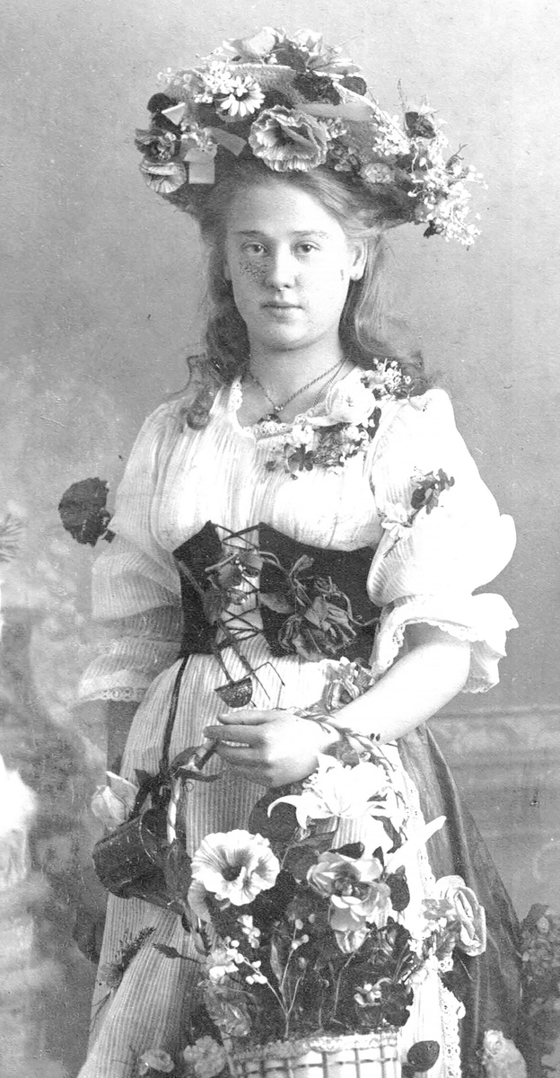 А вот на этой фотографии бабушка в костюме Флоры - богини цветов, весны и полевых плодов. Она умела хорошо делать цветы из бумаги, и скорее всего, этот костюм мастерила сама.