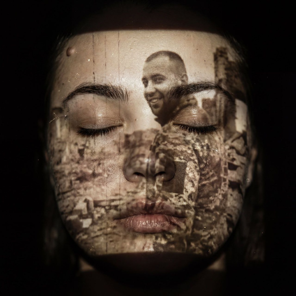 Крупный план лица девушки в темноте. Её глаза закрыты, выражение лица спокойное. На её лицо, как проекция из старой киноплёнки, проецируется чёрно-белое или сепия-изображение: её мужчина оборачивается и улыбается, уже в камуфляже, на фоне развалин. Свет проектора выхватывает пылинки в воздухе и текстуру её кожи. Эстетика старого кино и современного реализма. Ее кмакияж безупречен. Высококачественный макро-портрет, детализация 4K. #военные@annapromtii20