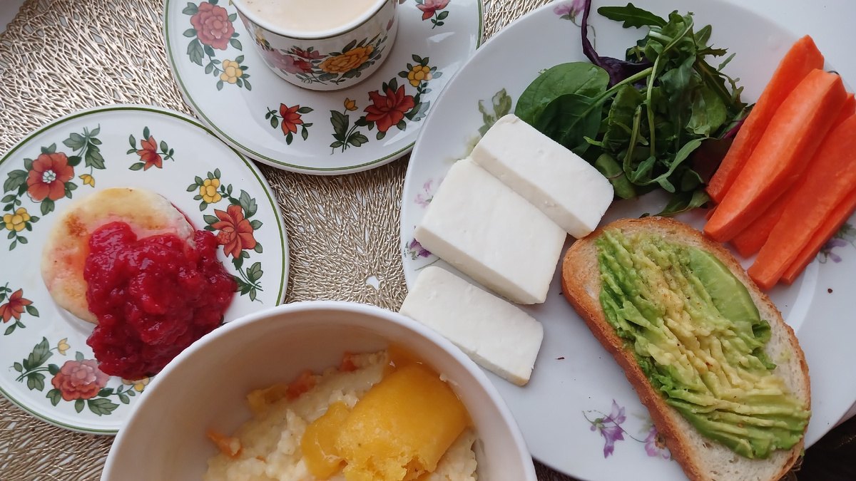 Завтракаем пшенной кашей с пюре манго. На второе собрала тарелки из того, что нашлось в холодильнике 😊 -салат месклам, брусочки моркови, тост с авокадо у меня и с риетом рыбным у мужа. К кофе были сырники с клубникой