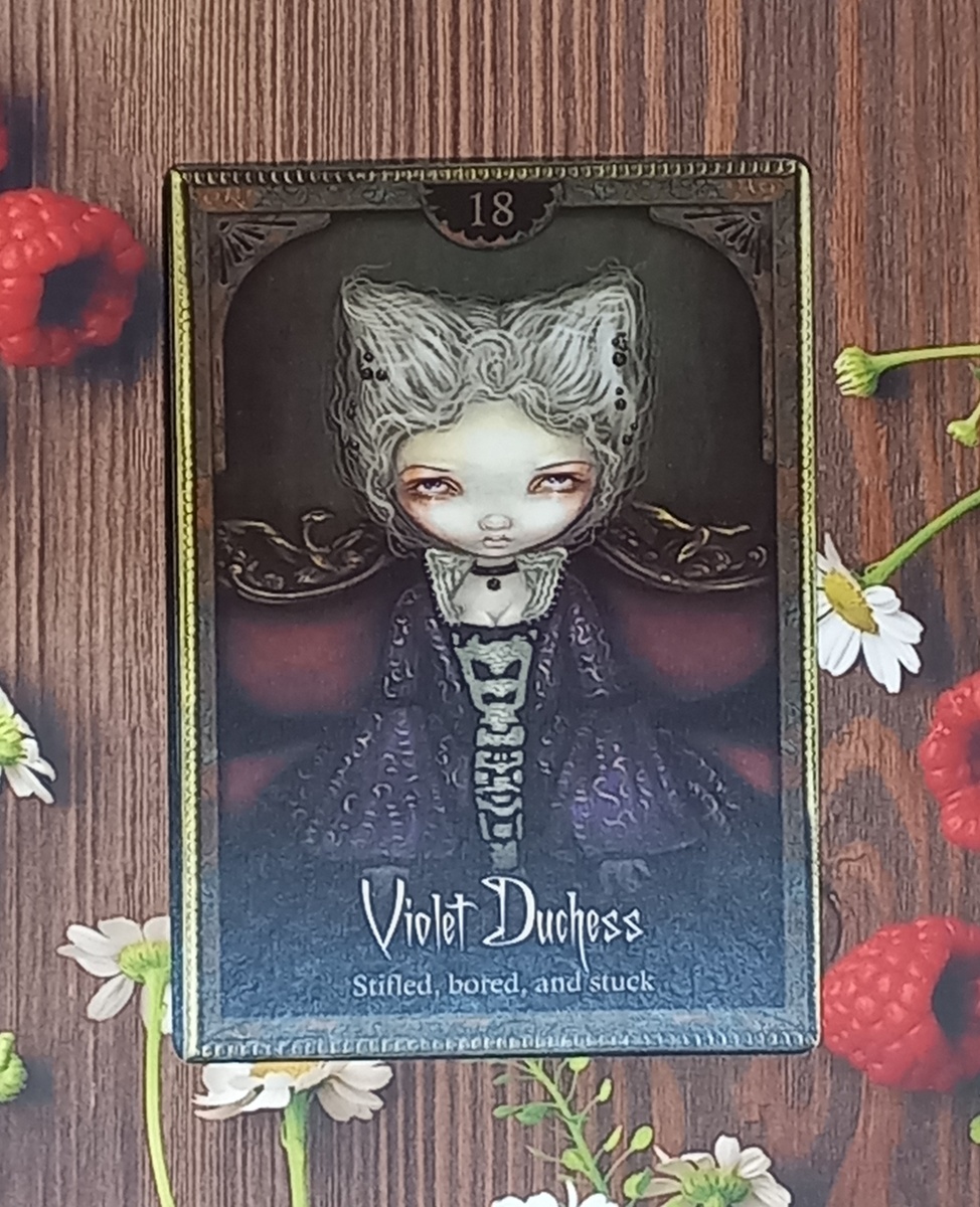 О Лиловой Герцогине : Она скучает и задыхается! О да, она старается быть хорошей, милой и вежливой – но это не срабатывает. Эта милая и очень страстная, аристократичная фея сложила свои крылышки так, что их совсем не видно. И сидит, застыв, слушая, как кто-то читает ей лекцию о хороших манерах. Внешне она вежлива и воспитана, но можно легко увидеть и ощутить, что ей скучно, что она находится в удручённом состоянии и готова улететь при первой же возможности. Она устала от строгости окружающих её людей, от своего подобающего, официального поведения, которое считается таким подходящим для Леди. Она обнаружила, что её ограничивает мир, в котором манеры и протоколы стали более важными, чем спонтанность, живость, магия и свобода – и как же ей этого не хватает! Пока она так и будет проводить время, но видно, как нарастает внутри неё разочарование. А это разочарование и уныние является, в общем-то, вашей жизненной силой, которая сейчас запрятана внут