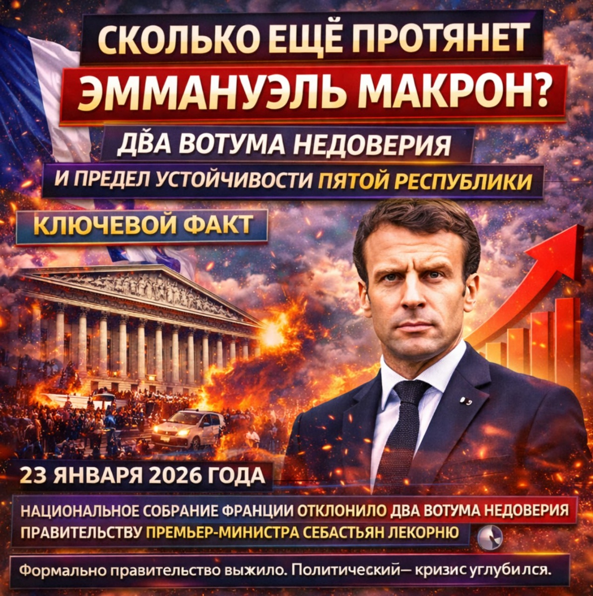 ? ⚙ 23 января 2026 года нацсобрание Франции отклонило два вотума недоверия правительству премьера Себастьян Лекорню после применения статьи 49.3 Конституции для проталкивания бюджета-2026 в обход голосования. ▪️ Формально правительство выжило, но кризис углубился. 1️⃣ Кто реально удерживает власть ▪️Вотум слева: 269 голосов «за», порог — 288, не хватило 19 голосов ▪️Вотум справа (RN): 142 голоса «за», провал с разрывом 146 голосов. 🔘Правительство выжило за счёт отказа Соцпартии (66 мест) поддержать любой из вотумов. Фактически: ни центристы Макрона, ни институциональные механизмы, а социалисты стали ключевым стабилизатором режима. 2️⃣ Реальная структура парламента (после выборов 2024): левые — ~180 мест, центристы Макрона — ~160 мест, Rassemblement National — ~142 места, Республиканцы — ~40 мест Абсолютное большинство — 289 3️⃣ Почему статья 49.3 не спасает систему 49.3 создавалась как инструмент для дисциплинированного большинства или слабой оппозиции. 🔘Факт: Лекорню публично обещал