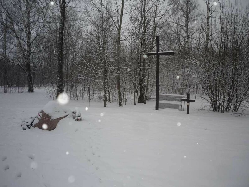 10 апреля 2010 года под Смоленском произошла крупная авиакатастрофа. Разбился самолёт Ту-154М, в котором летела польская делегация во главе с президентом Польши Лехом Качинским. Погибли все бывшие на борту 96 человек (88 пассажиров и 8 членов экипажа). Уезжая из Смоленска, мы посетили это печальное место, и оно поразило нас несколькими моментами. Мемориал оказалось не так просто отыскать. Никаких указателей к нему нет. У нас были координаты, но как ехать мы не представляли. Сначала покрутились у трассы. Потом удалось выловить местного жителя, который был в теме и объяснил куда ехать: около пожарной части и заправки есть дорога, которая и приведет к мемориалу. Но даже после этого объяснения мы заехали не туда: запорошенная снегом, но проезжаемая дорожка привела нас к закрытым воротам воинской части. Оказалась, что нужная дорога сразу за заправкой отходит вправо. Она была занесена снегом, без следов, не удивительно, что мы её не заметили. Машину оставили возле пожарной части, а сами прог