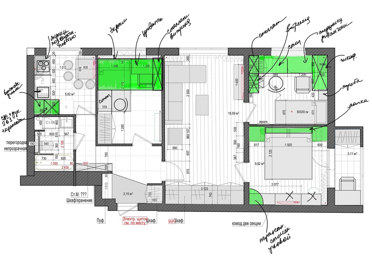 идёт. Я заглянула в планировку и спросила: «Нужны ли мои комментарии по расстановке мебели?» Оказалось — нужны. Всё время консультации ушло на то, чтобы сделать планировку более жизнеспособной. 1) Первое на что я обратила внимание - это на расстановку техники в кухне и на размер рабочей поверхности. Предложила корректировки 2) В ванной комнате (на данном чертеже) уже внесены корректировки по моим рекомендациям ещё ДО консультации. Поменяли местами раковину и стиральную машину 3) В комнате для подроста, развернули кровать вдоль окна и выстроили мебель в более удачную конфигурацию, тем самым увеличивая свободное пространство в центре комнаты 4) Во второй детской так же развернули мебель вдоль окна и нашли место для стеллажей, где будут храниться многочисленные кубки и для вместительного шкафа для одежды 5) В спальне взрослых убрали громоздкую мебель, сужающую проходы, поставили шкафы по бокам от кровати и добавили небольшой туалетный столик с пуфом Мораль: Иногда нужен взгляд со