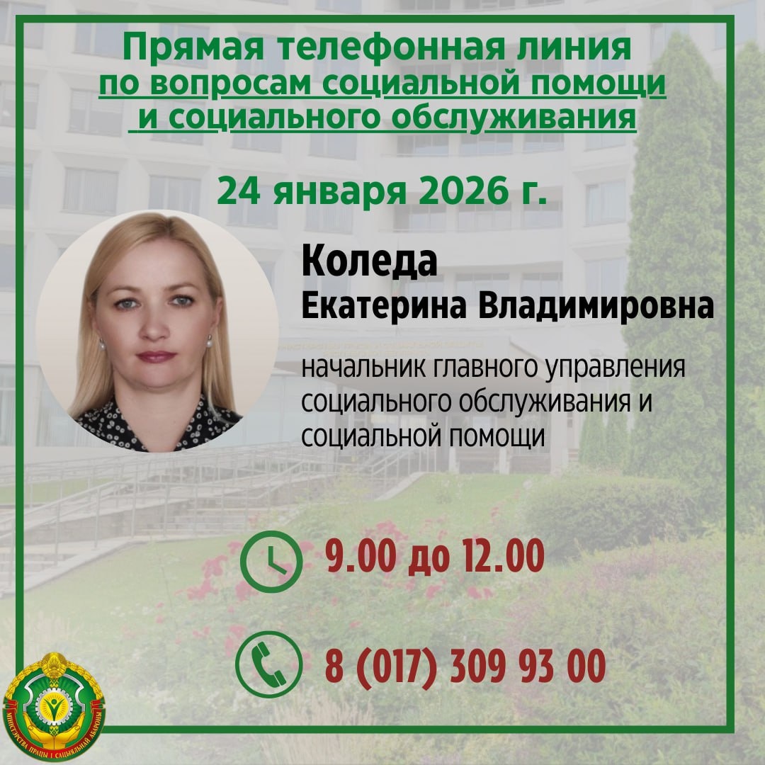 Завтра, 24 января, на прямой телефонной линии - начальник главного управления социального обслуживания и социальной помощи Коледа Екатерина Владимировна. 💬Тема: вопросы социальной помощи и социального обслуживания. ⏰9.00 до 12.00 ☎️ (8017) 309 93 00