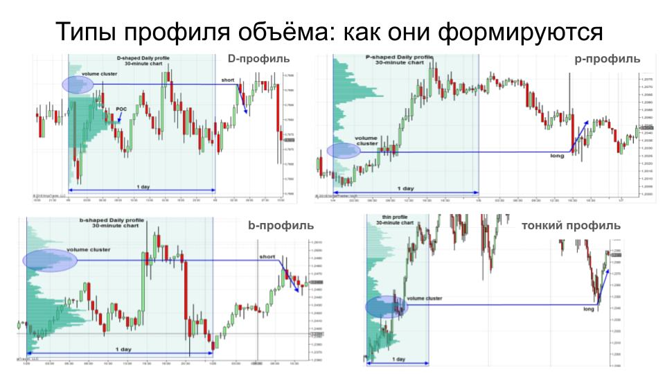 Существует 4 основные формы, которые может формировать профиль объёма: Профиль объёма (Volume Profile) показывает распределение объёмов по ценам, а не по времени. То есть ты видишь, на каких ценах участники торговали активнее всего. Наиболее распространенным и известным является D-профиль. Это означает, что покупатели и продавцы нашли временное равновесие и ни один из них не действует агрессивнее другого. Что делать: По форме он напоминает букву "Р". Она образуется при наличии агрессивных покупателей и слабых продавцов. Что делать: По форме он напоминает букву "b". (Полная противоположность P- профилю.) Он формируется при наличии агрессивных продавцов и слабых покупателей. Что делать: Тонкие профили появляются при наличии сильного восходящего или нисходящего тренда. Одна сторона рынка очень агрессивна и быстро двигает цену в одном направлении. Наиболее значимые места в тонком профиле - это места, где цена на некоторое время прекращала движение. В этих местах агрессивные участник