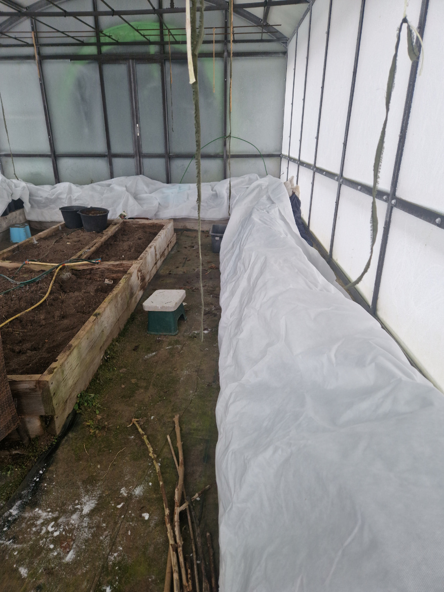 Зашла в теплицу, укрыла дополнительным полотном спана прикопанные в грядку контейнерные