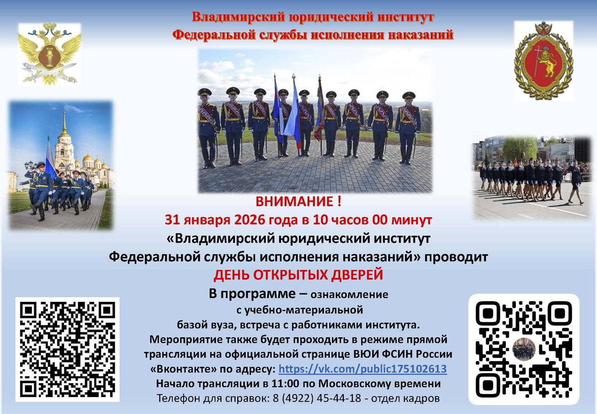 Внимание! 31 января 2026 года в 10.00 во Владимирском юридическом институте ФСИН России состоится день открытых дверей для абитуриентов