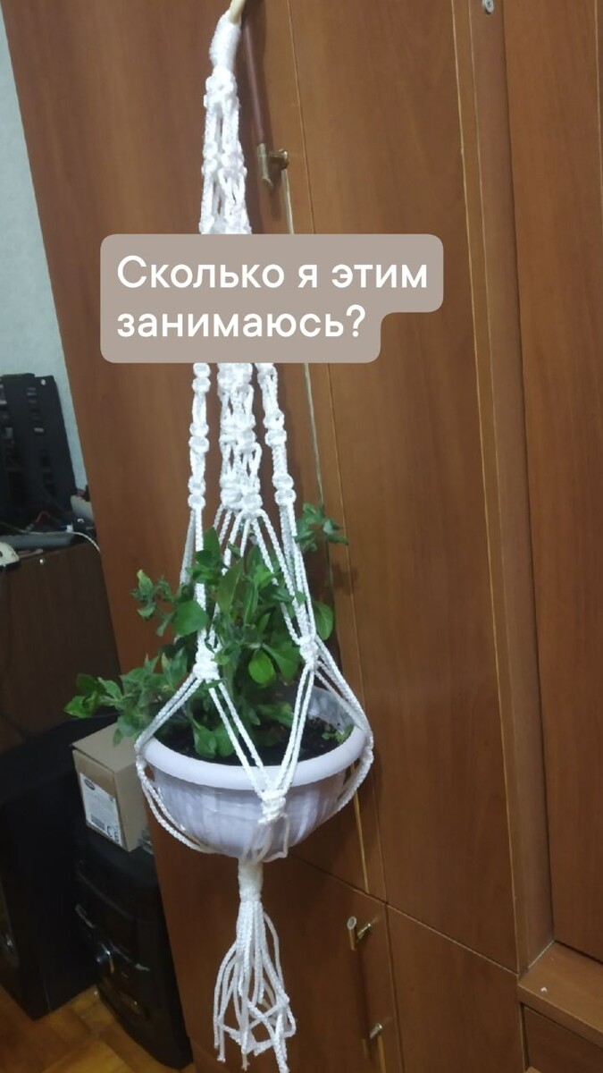 В середине 80-х годов, это было модное рукоделие. Многие девочки пишут, что ходили в кружок в школе или в пионерском лагере. Я в то время тоже была школьницей, но научила этой технике меня моя мама. Тогда не было интернета и она после работы ходила на курсы по макраме. Она дома заканчивала свои работы, я за ней повторяла и помогала,так и научилась. В то время плели в основном из бельевой верёвки, с нитками была напряжёнка. Я вообще себе сумку сплела из какого- то шпагата, но зато была самая модная 😊 Лет 5 назад на выставке цветов я увидела подвес (кашпо) и мне захотелось такое себе на дачу повесить, на веранду. Пришла я такая воодушевленая, достала мамины записи и фото тех лет. Сбегала в хозяйственный магазин и купила шнур. Сплела первое кашпо(см.фото). Руки то помнят, а техники то нет, поэтому оно(кашпо) получилось карявенькое. Полезла в интернет, смотреть что да как, а там" мама дорогая" чего только нет про макраме: мастер классы бесплатные и курсы платные и даже школы по макрам