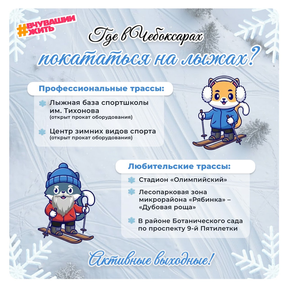 Морозец так приятно холодит кожу, что так и хочется отправиться на поиск зимних приключений! Может именно в эти выходные пора встать на лыжи? Главное одеться потеплее, взять термос с горячим чаем и позвать с собой друзей, а где покататься мы уже нашли за вас. 👆🏻 Если вы не из Чебоксар или вас потянуло на коньки, а не на лыжи, найти список катков, хоккейных коробок и лыжных трасс в регионе можно на сайте Минспорта Чувашии. Подписаться / Предложить новость