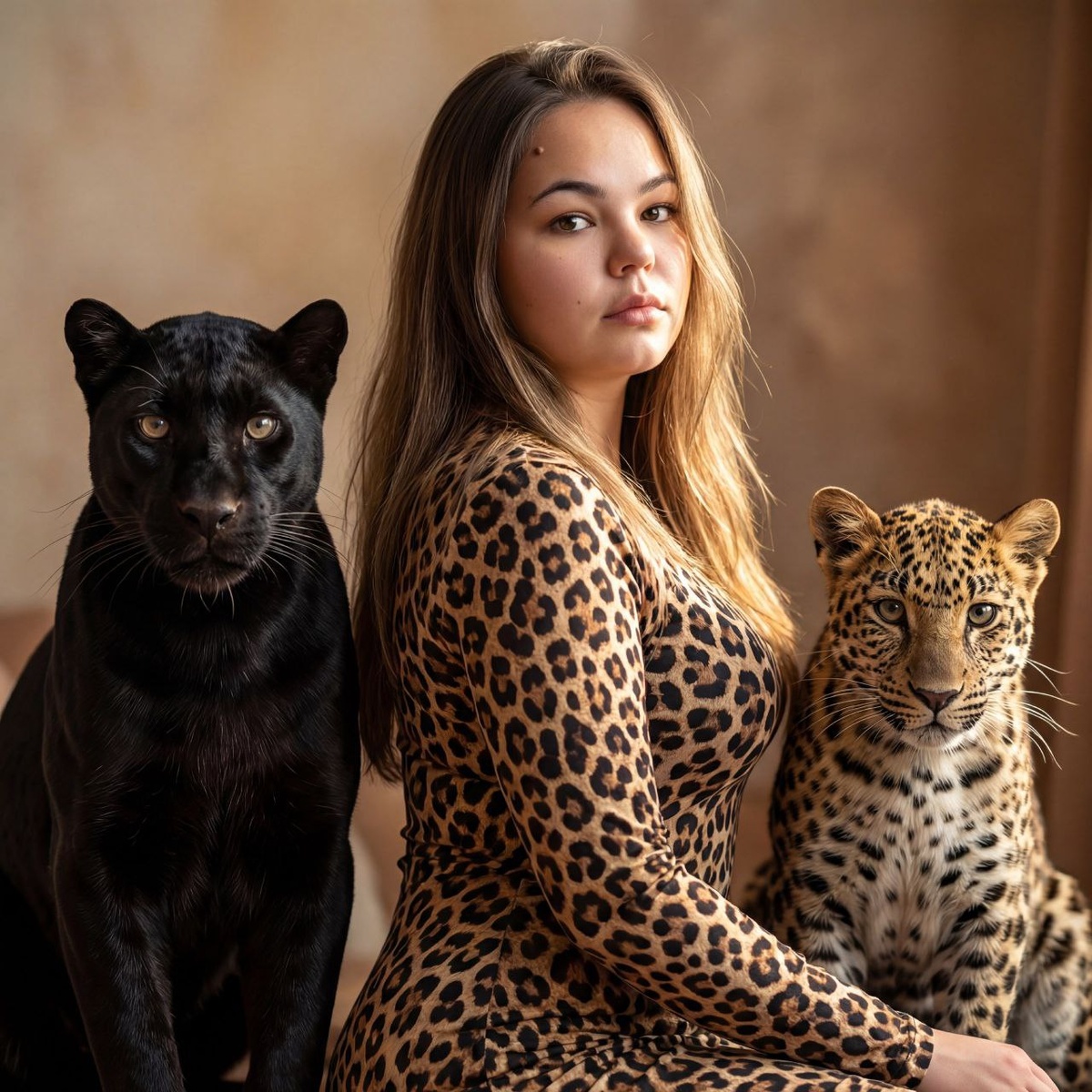 Она сидит в профиль, немного повернувшись лицом к камере, в облегающем леопардовом платье с длинными рукавами, подчеркивающем силуэт. Ее спокойное, сосредоточенное лицо и взгляд прямо на зрителя придают загадочность и силу. Слева рядом черная пантера с гладкой блестящей шерстью и выразительными глазами, справа впереди молодой леопард с типичным пятнистым узором, оба смотрят в камеру. Фон размытый с бежево-коричневыми тонами, создающий уют и теплое освещение. Свет с правой стороны подсвечивает лицо, волосы и шерсть зверей, формируя мягкие тени и глубину. Высокая детализация: каждая прядь волос и шерсть живые, реалистичные глаза. Фотореалистичное, 8K, теплые естественные оттенки, высокая текстурная детализация. #сживотными@annapromtii20
