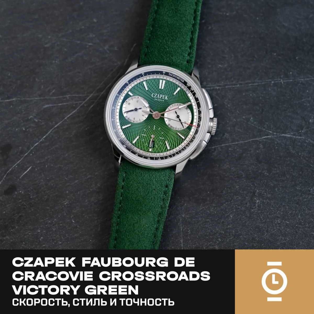 #новости_WD Швейцарская Czapek & Cie, возрождённая в 2015 году, продолжает развивать своё направление «спортивной элегантности». Новинка Faubourg de Cracovie Crossroads Victory Green Chronograph — лимитированная серия из 18 экземпляров — сочетает классический дизайн с оттенком автоспортивной энергии. Коллекция Faubourg de Cracovie, представленная в 2018 году, стала первым хронографом бренда, оснащённым калибром SXH3, созданным совместно с Vaucher Manufacture Fleurier. Это полностью интегрированный автоматический механизм с частотой 5 Гц (36 000 пк/ч), колонным колесом и вертикальным сцеплением, обеспечивающий идеальную плавность включения и мгновенный возврат стрелок. Запас хода — 65 часов, хронометр сертифицирован COSC. Корпус диаметром 41,5 мм выполнен из нержавеющей стали 316L и сочетает полированные, сатинированные и пескоструйные поверхности, подчёркивающие архитектурную геометрию модели. Хронографические кнопки встроены в защиту заводной головки, придавая корпусу аэродинамичны