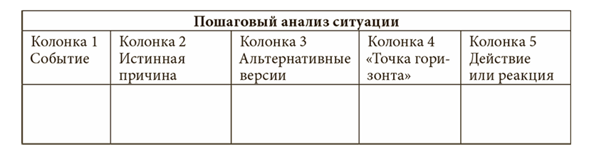 Следующие пять шагов помогут вам понять, почему вы реагируете на определенную ситуацию именно так и как можно было бы отреагировать иначе с положительным результатом. В итоге вы заполните таблицу «Пошаговый анализ ситуации»