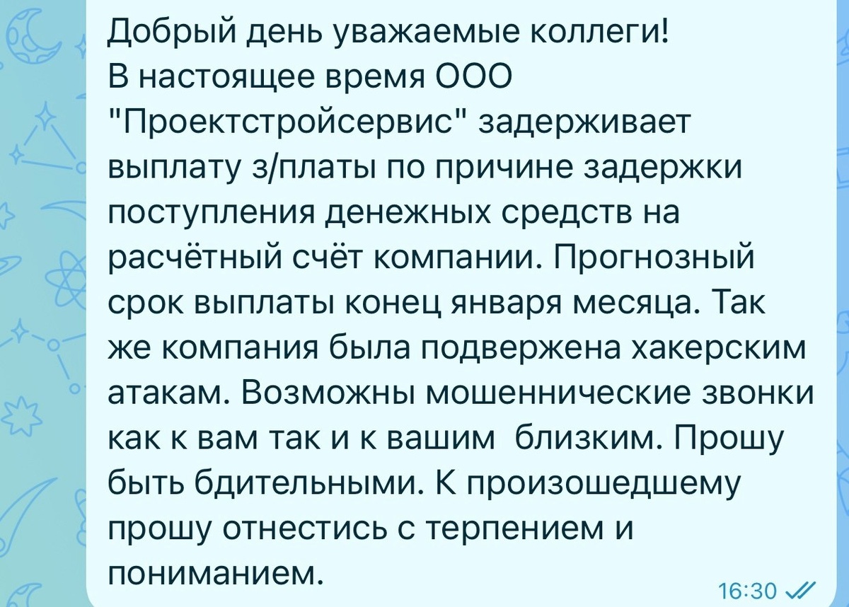 Вот что руководство пишут сотрудником. Хочет задать вопрос руководству, а вы терпите или ваши дети когда кушать хотят вы им тоже говорите потерпите. А банком и управляющим компании тоже нужно сказать что бы они потерпели. Админ анонимно пожалуйста