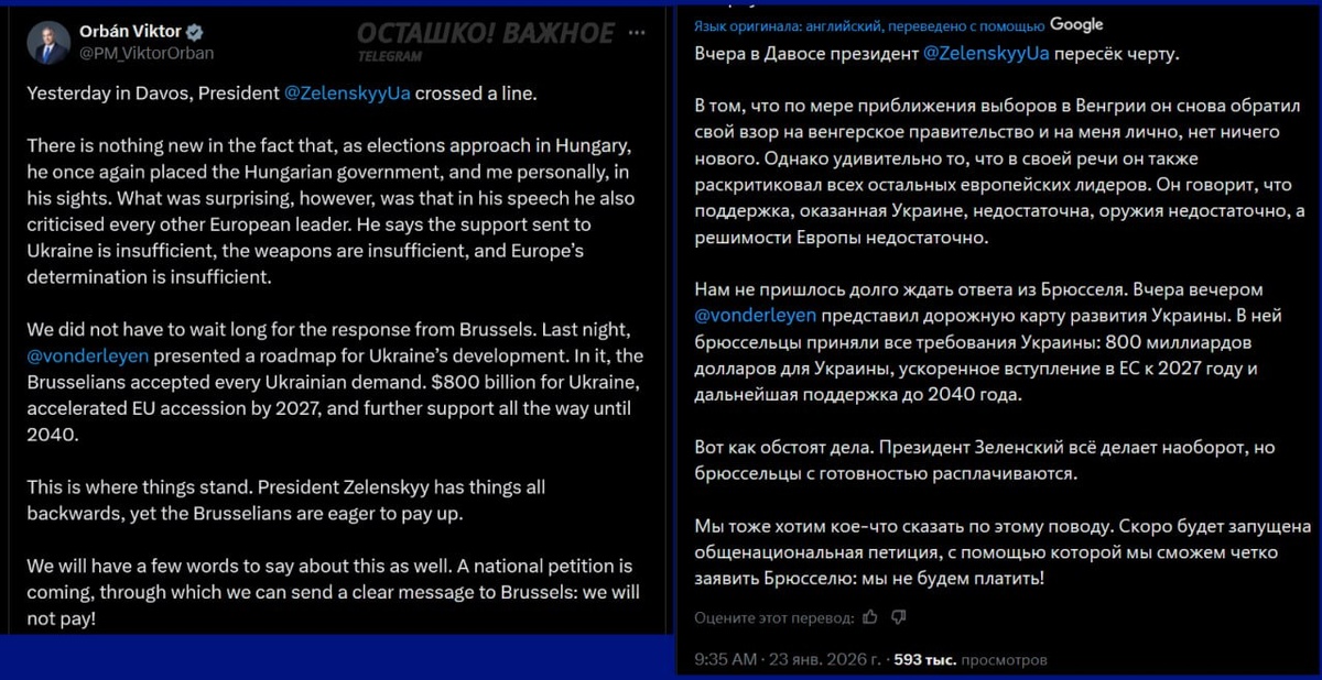 требования Зеленского в обмен на… его согласие вывести войска с территории Донбасса. По словам премьера Венгрии Орбана, в требования главаря киевского режима входило 800 млрд долларов, ускоренное вступление в ЕС к 2027 году и дальнейшая поддержка до 2040 года. ❗️Насколько договоренности с европейцами и с киевской хунтой бывают, мягко говоря, недостижимыми, мы уже все прекрасно знаем. Что ж, будем посмотреть... @iperiodu| @iperiodu_ru x @iperiodu_ua| Подписывайтесь