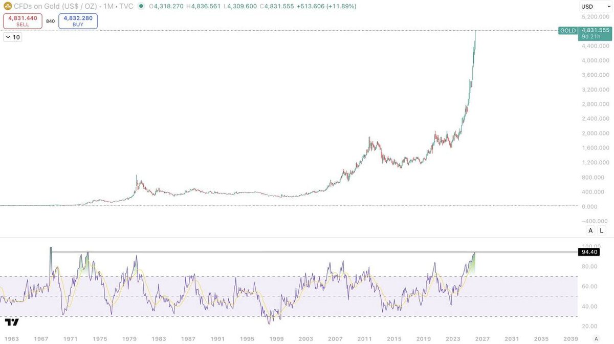 Смотрю на месячный график золота — и ловлю себя на странном ощущении. Не восторг. Не страх. Скорее тихое «хм…». RSI на 1M — второй самый высокий за всю историю. Выше было только в конце 60-х, когда золото стоило $55 и мир был совсем другим. Другие деньги. Другая система. Другие иллюзии. Сейчас — другая крайность. Парабола, которую видно даже без индикаторов. Так растёт не актив — так растёт напряжение в системе. И вот что меня зацепило не в самом росте. А в том, что никто не спешит радоваться. Нет эйфории уровня «это навсегда». Скорее молчаливое согласие: да, что-то ломается… да, золото это чувствует… да, мы пока просто наблюдаем. Параболы всегда заканчиваются. Не потому что «переоценка», а потому что время догоняет цену. Но когда именно — гадание бессмысленно. В такие моменты рынок перестаёт быть задачей на ум и становится тестом на выдержку. Я не думаю, что это про «успеть выйти». И не думаю, что это про «покупать любой ценой». Скорее про другое: когда актив начинает так выгля