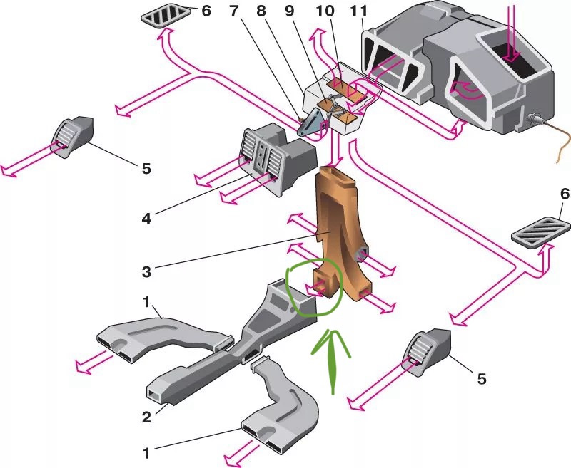 К сожалению, инженеры предприятия "АвтоВАЗ" не учли конструктивные особенности системы отопления, а именно недостаточную мощность вентилятора отопителя и избыточное количество воздуховодов, что существенно снижает эффективность обогрева салона. В связи с этим необходимо провести модификацию системы для обеспечения её оптимальной работы. В качестве первого этапа модернизации рекомендуется демонтировать задние воздуховоды, поскольку под ними, как правило, скапливается значительное количество пыли, что затрудняет их очистку с помощью пылесоса и снижает интенсивность обдува задних пассажиров. На представленной ниже схеме данные воздуховоды обозначены цифрой "1" и крепятся с помощью одной гайки, расположенной в центральной части конструкции. Для достижения поставленной цели необходимо обратиться к указанному отверстию, обозначенному зеленым цветом на схеме. Данное отверстие служит для обеспечения притока воздуха в систему задних воздуховодов. Однако, несмотря на наличие воздушного потока,