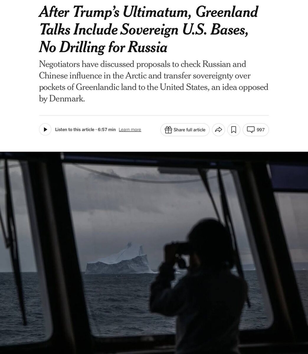 Этот пункт обсуждается в рамках переговоров по будущему острова после ультиматума Трампа. Ограничения будут действовать на все страны, не входящие в состав НАТО и отдельно сфокусированы на России и КНР. Инициатива направлена на ограничение влияния Москвы и Пекина в Арктике и рассматривается параллельно с усилением присутствия НАТО в регионе. 🌐 За Русский Мир©Резервный📣Наш Чат✔️Подпишись‼️