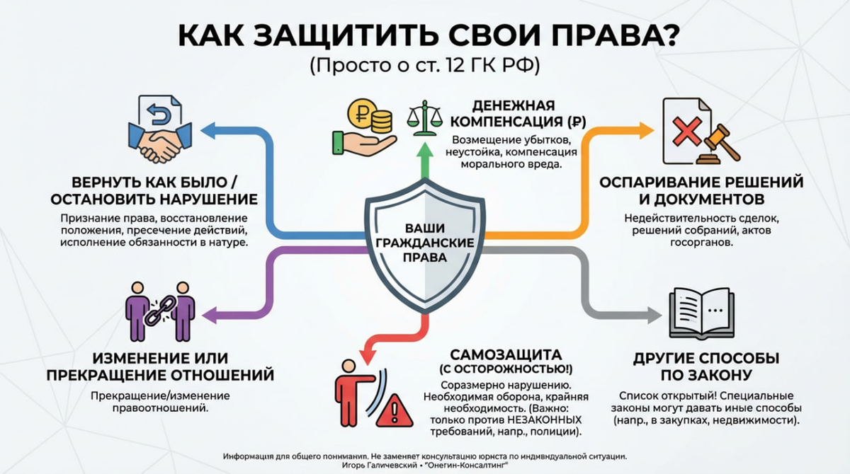 Привет! Меня зовут Галичевский Игорь, основатель юридической компании "Онегин-Консалтинг", адвокат и действующий арбитражный управляющий. В этой статье я расскажу вам о способах защиты права в гражданском процессе. Ст.12 ГК РФ (ч.1) определяет следующие способы защиты гражданских прав: - признания права; - восстановления положения, существовавшего до нарушения права, и пресечения действий, нарушающих право или создающих угрозу его нарушения; - признания оспоримой сделки недействительной и применения последствий ее недействительности, применения последствий недействительности ничтожной сделки; - признания недействительным решения собрания; - признания недействительным акта государственного органа или органа местного самоуправления; - самозащиты права; - присуждения к исполнению обязанности в натуре; - возмещения убытков; - взыскания неустойки; - компенсации морального вреда; - прекращения или изменения правоотношения; - неприменения судом акта государственного органа или органа местного