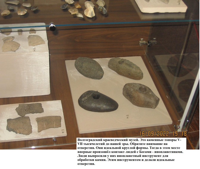 Наконец-то после многолетней реконструкции открылась экспозиция в Волгоградском краеведческом музее. Про ариев там нет уже и намёка, но кое-что интересное в плане рассматривоемой концепции имеется. Есть каменные топоры, относящиеся к V-VII тысячелетию до н.э.. В VII тысячелетии до н.э. до прибытия экспедиции Сверхцивилизации (Богов) каменные топоры делались без отверстия под ручку. Это было очень неудобно. Но с прибытием первой экспедиции люди выпросили у Богов инструмент внеземного происхождения для обработки камня. Топоры стали делать из природных необработанных или слабо обработанных камней, но круглые отверстия под рукоятку в них выполнены идеально. Для рукоятки, кстати, такая форма отверстия не вполне подходящая. Рукоятка в нём вращается. Правильнее было бы делать отверстие овальным. Но люди, по-видимому, не достаточно хорошо умели пользоваться инструментом, предоставленным им Богами-инопланетянами. Они научились делать только отверстия простейшей формы. В экспозиции музея имеется