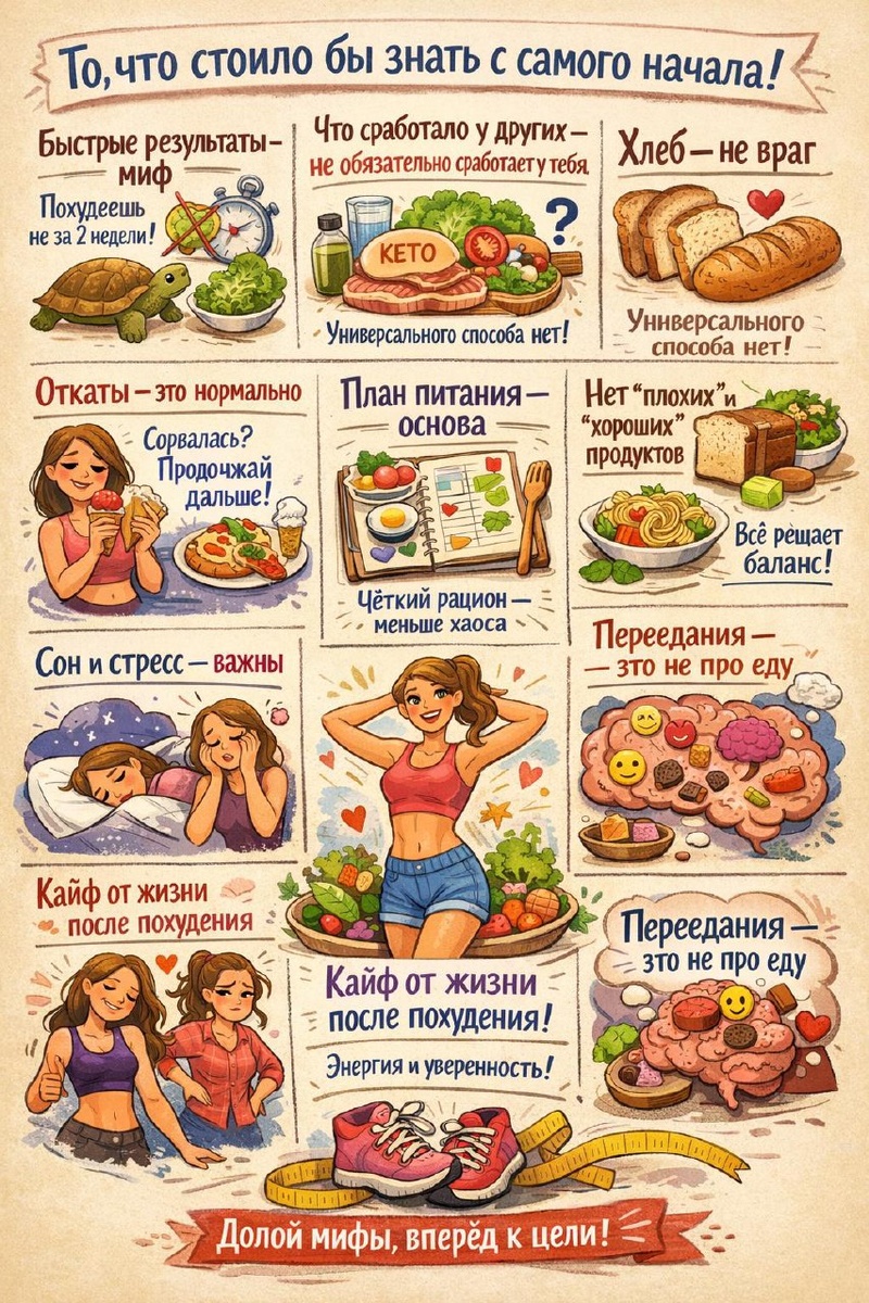 Тема — похудение. То, что сэкономило бы вам и мне кучу времени и нервов, если бы вы знали это с самого начала: 🔸 Быстрые результаты — миф. Вес набирается не за неделю. А сбросить его за пару месяцев — фантазия. Можно, конечно, залететь на экстремальную сушку и посидеть на воде и листе салата — но потом обязательно откатит. 🔸 То, что сработало у кого-то — не обязательно сработает у тебя. Интервальное голодание, кето, подсчёт калорий до миллиграмма — всё это работает, но только если подходит лично тебе. Универсального способа нет. 🔸 Хлеб — не враг. Большинство людей и моих клиентов избегают и боятся хлеба как огня... Проблема не в хлебе, а в том, что у многих он становится единственным источником углеводов. 🔸 Откаты — это нормально. Переела? Не надо паниковать, наказывать себя тренировками или голодовками. Просто возвращаешься в режим — и всё. 🔸 План питания — основа. Если есть чёткий рацион — нет хаоса, нет “случайных” перекусов и меньше шансов сорваться. 🔸 Нет “плохи