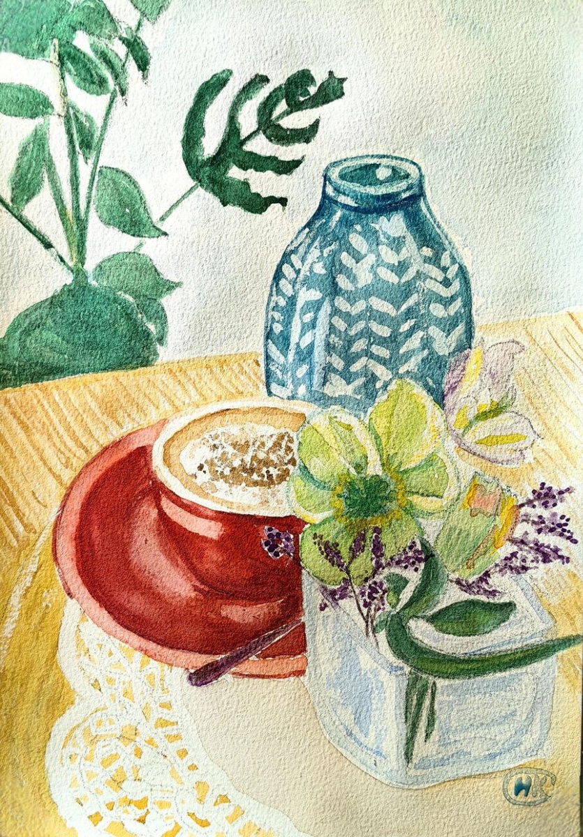 Нарисовала чашку кофе и цветы на кружевной салфетке.