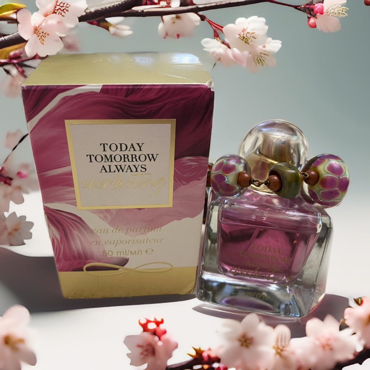 Today Tomorrow Always Everlasting Avon — это цветочный аромат, выпущен в 2024 году. Верхние ноты: Миндальное молочко, Груша, Жасмин и Слива; средние ноты: Цветок миндаля, Тубероза и Нероли; базовые ноты: Мускус, Белый сандал и Амбра. Стартует кондитерскими нотами мускуса миндаля, бисквита, пирожного с миндальным кремом. Слива добавлена в виде нескольких капель компота, почти неощутима. Парфюм достойный, запоминающийся. По мере раскрытия становится более мягким, как запах крема. В целом можно описать как очень насыщенный клубнично-лимонный крем-десерт. НО откуда-то еще слышатся кокос и рассол. Это не минус, скорее плюс к многогранности. Необычно, но гармонично. По мнениям пользователей, он очень многим нравится. Отмечают базу аромата Authentic Moments Abercrombie&Fitch, но более легкую и воздушную. Стойкость и шлейф приличные, я ощущаю часов до 5 с одежды, потом затихает. Некоторые дорогие люксы менее стойкие, надо признать. Как все Тудеи в Эйвоне, этот парфюм качественный, добротны