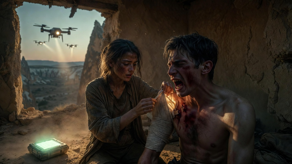Их убежищем стал один такой дом с провалившейся крышей. Элиф, дрожащими руками, достала аптечку, подаренную старым Ахметом. Там было всё необходимое для полевой медицины: кровоостанавливающий порошок на основе хитозана, антисептик, биопластыри с регенерационным гелем. Пуля, к счастью, была малокалиберной, «нелетальной» — видимо, действительно старались взять живыми. Она прошла навылет, раздробив ключицу.