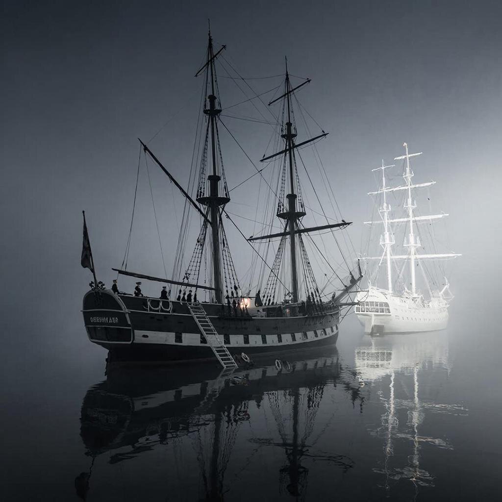 Согласно этой легенде, «Кобенхавн» попал в такой штиль. И экипаж, доведённый до отчаяния, увидел спасение. Другой корабль, тоже пятимачтовый, призрачно-белый, плывущий без ветра. Он подошёл близко, почти вплотную. И с его палубы манили, звали перейти. Говорили, что там есть вода, еда, спасение. И люди, обезумев от жажды и тишины, начали перебираться. Переходили по сходням, прыгали в воду, чтобы доплыть. А капитан Андерсен, пытаясь остановить их, оставался один на опустевшем гиганте. И тогда «Морская Вдова» сделала последний подарок. Подул лёгкий, ласковый бриз. «Кобенхавн», теперь уже корабль-призрак с одним-единственным человеком на борту, медленно, величаво, тронулся с места. И поплыл. Поплыл не по курсу. Он поплыл прямо в густой, непроницаемый туман, который стоял на горизонте чёрного зеркала. И скрылся в нём. А туман потом рассеялся, и море снова стало просто морем. Пустым.