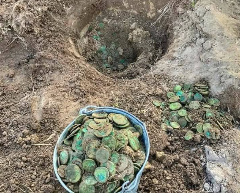 Часть — прямо в земле, часть — в емкости, словно человек не успевал считать, а просто складывал всё подряд. Впечатление не археологическое, а человеческое: спешка, азарт, жадность, страх потерять. По словам очевидцев, из этого места извлекли четыре полных ведра монет. Не горсть. Не «несколько экземпляров». Именно ведра — бытовая мера, почти унизительно простая для такого количества металла. И в этой простоте — главный холодок. Что это было?