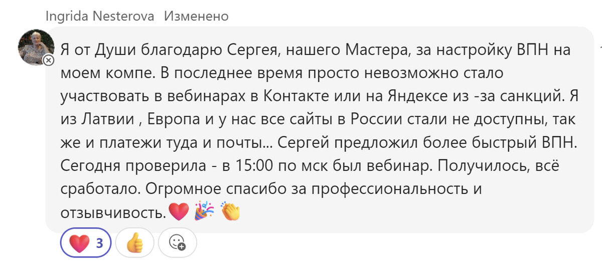 Ингрида живёт в Латвии, в последнее время стало сложно участвовать в вебинарах на российских платформах — сайты не открывались, трансляции не запускались, бесплатные VPN работали нестабильно или не работали вовсе. Это частая ситуация: ограничения по регионам мешают работе и обучению. Мы решили не экспериментировать дальше, а сразу поставить профессиональный VPN — быстрый, стабильный, без ограничений по трафику. После настройки: — вебинар на ВКонтакте спокойно открылся в нужное время; — трансляция прошла без сбоев; — соединение держится стабильно, без «плясок» с VPN. Задача была простой: чтобы работало. И теперь — работает. 💬 Отзыв Ингриды на скрине. #отзывы Master S