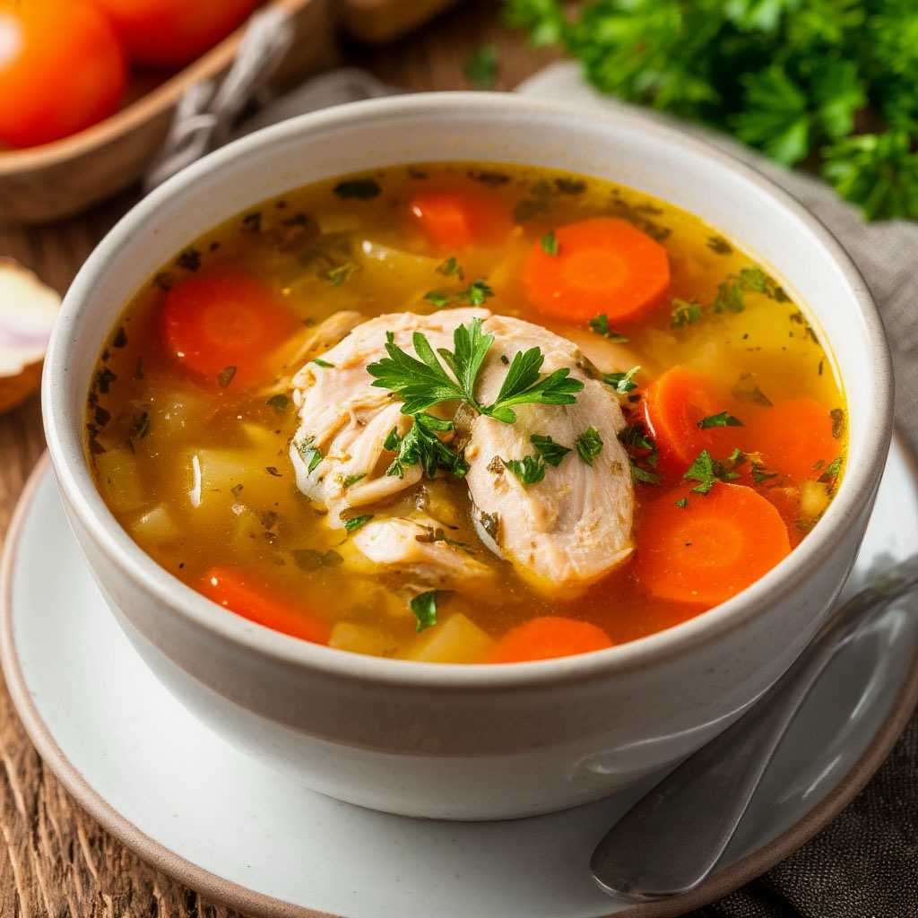 - Нежный бульон с кусочками курицы,морковью, сельдереем и укропом. Легкоусваивается, поддерживает иммунитет.