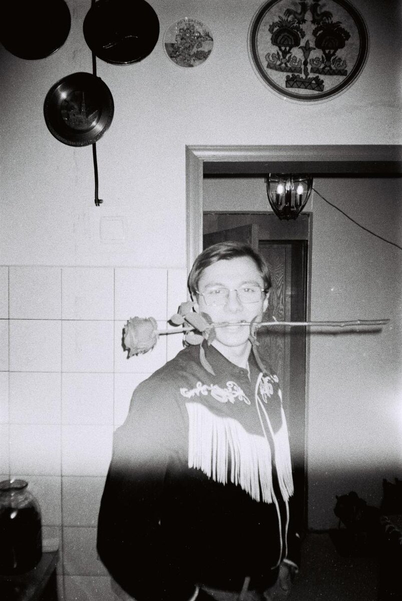 Проявлено (После Уфы) 1) Рубашку подарил Илья Дубовка. Розу нашёл в гримёрке. Первый кадр после Уфы — попытка вжиться в роль человека, для которого роза в зубах — это нормально. Получилось как у Антонио Бандераса, только честнее. 2) Илюха. Сидит в кресле, как будто родился в нём. Смотрит так, будто знает, за сколько продаст этот кадр. 3) А это — обратная сторона света. Пока кто-то примерял роли, мы таскали их декорации. Отдыхали на мешках. Самый честный кадр со съемок. 4) Выпускной в школе кино. Шёл, как на первую линейку. Внутри — смесь восторга и стыда: «Господи, я и правда думаю, что имею к этому отношение?». 5) Ребята с короткометражки. Мы играли братьев, которые делят наследство. В перерывах делили сигареты и сомнения: «А кто это вообще будет смотреть?» Их трепет был виден даже на плёнке. В этом была вся наша тогдашняя правда. 6) Выпускники. В глазах у каждого — грандиозные планы. Мы тогда не знали, что 90% из нас больше никогда не окажутся на одной площадке. Этот кадр — ка