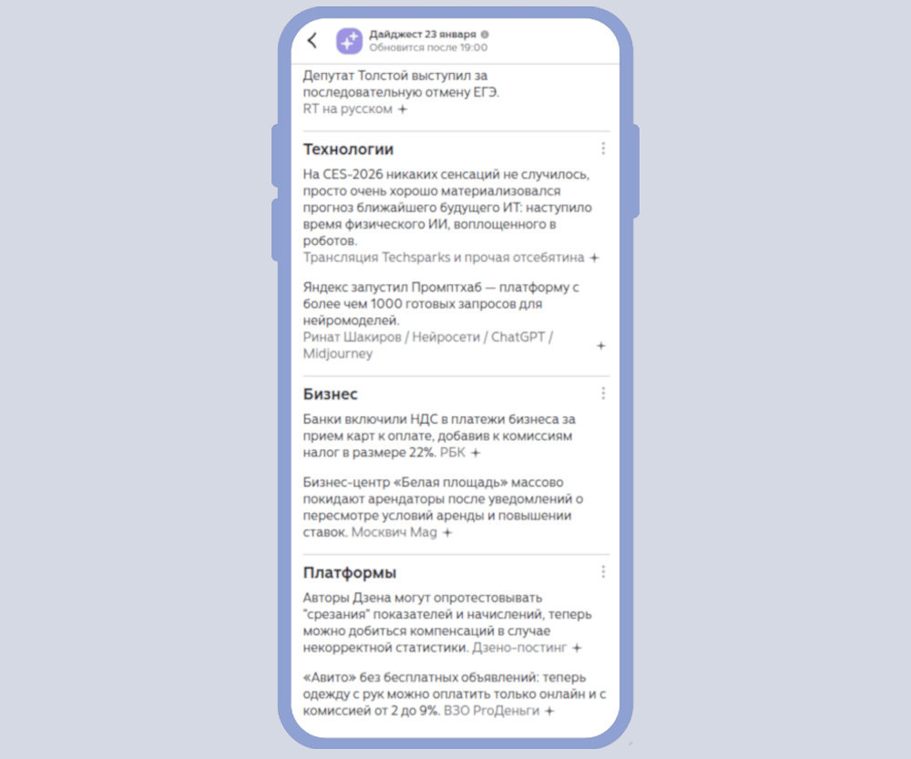 В справку Дзена внесены изменения в описание платной подписки «Дзен Про». Теперь среди преимуществ значится новая функция — «AI-дайждест»: «С активной подпиской вам доступен новостной дайджест, автоматически собранный из различных источников. В подборку могут попасть как актуальные новости, так и развлекательные статьи». В мой дайджест включили следующее: Впрочем, возможно, тут дело в том, что СМИ часто так поступают — месяцами мусолят одну и ту же новость, выдавая её за что-то новое, но DeepSeek с Дзеном засовывают эту новость как в ленту, так и в дайджест. Неожиданно. Рад что хоть тут не забыли о том, что в Дзене есть ещё что-то, кроме новостей. Немного удивляет, что дайджест формируется раз в сутки. Не думаю, что в Дзене решили, что пользователям с подпиской «Дзен Про» предлагается заходить на платформу лишь один раз в день; скорее всего, таким образом снижают интенсивность обращений к API DeepSeek. Новой возможности для меня ещё недостаточно, чтобы оформить подписку (возможность о