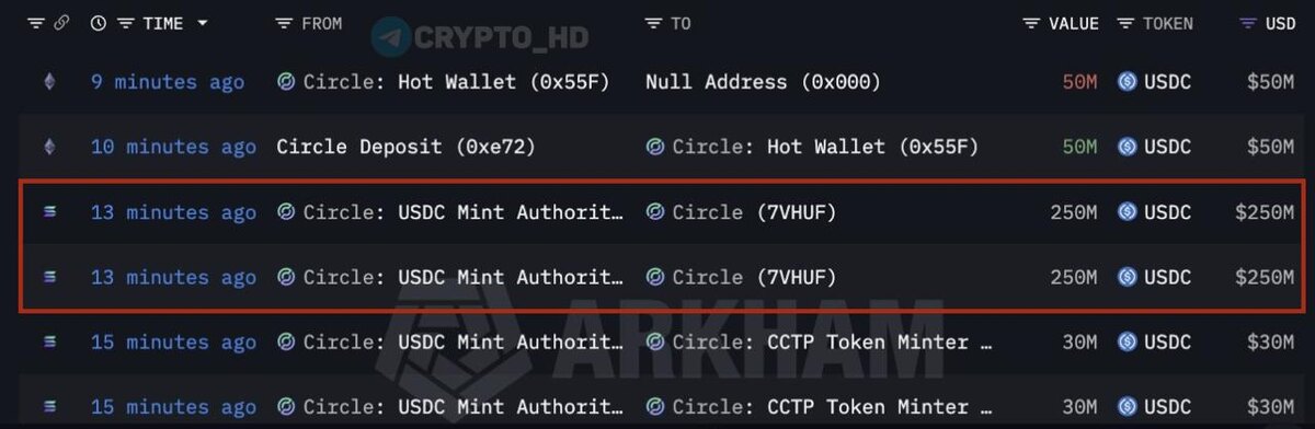 🖨 Arkham: В Circle напечатали свежие 500,000,000 #USDC
