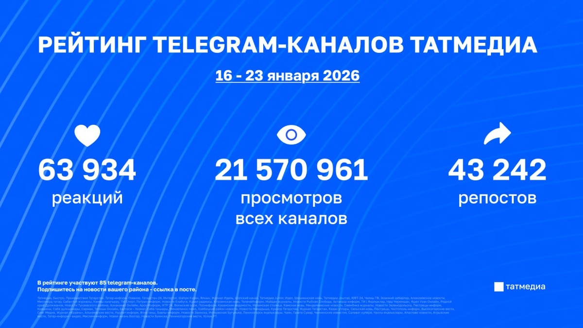📱📈Свежая статистика telegram-каналов Татмедиа | 16 - 23 января Каналы с наибольшим числом просмотров: 1. ТАТМЕДИА - 2 499 940 2. Новости Зеленодольска - 1 249 665 3. БЫСТРО - 1 034 458 4. Нурлат-информ - 969 334 5. Интертат - 909 582 Посты с наибольшим числом просмотров: 55 960 🔹 Живые истории: «Здесь контракт подписывают?»: о личном выборе мужчин Татарстана. 49 365 🔹 ТАТМЕДИА: 2,9 млн рублей: в Татарстане самая высокая единовременная выплата в ПФО при подписании контракта. 32 006 🔹 ЧЕЛНЫ ТВ: В Татарстане учреждена премия Раиса РТ «Добрый Татарстан». 26 361 🔹 Миллиард Татар: Афганские татары поддержали идею назвать улицу в Кабуле в честь Минниханова. 15 441 🔹 Интертат: БАБАЙГА - 89! 12 955 🔹 Происшествия Татарстан: После нападения ученика в лицее Нижнекамска возбудили уголовное дело. 11 274 🔹 Татар-информ. Главное: В Татарстане стартует конкурс на лучшее зимнее оформление двора. 11 147 🔹 ТИ-Спорт: Вышел в эфир первый в 2026 году выпуск программы «Спорт без прикрас