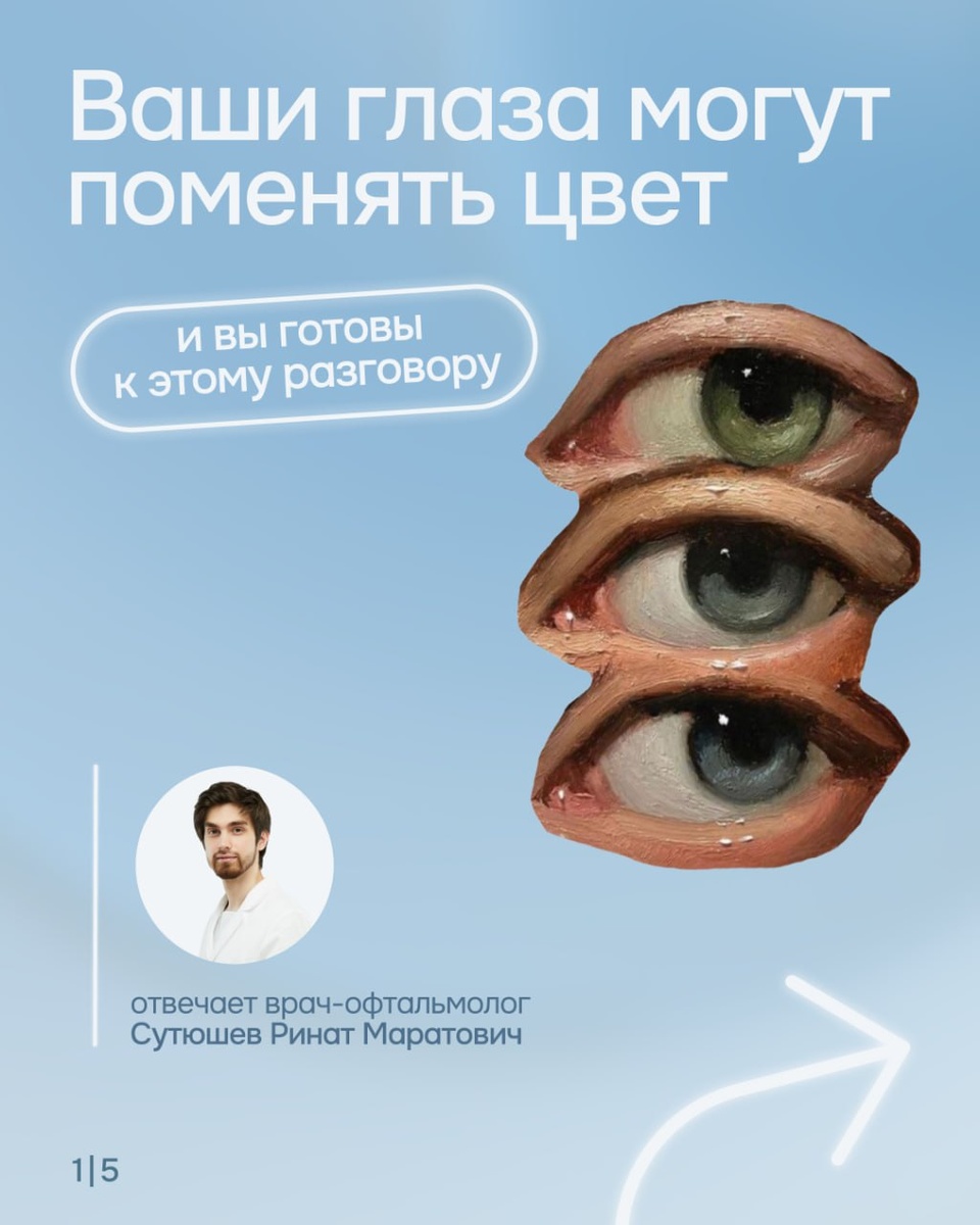 Или нет? 👀 Про душу спорить не будем, но вот цвет глаз точно может удивить. Он может меняется у детей, взрослых, и причины бывают самые неожиданные. Листайте карточки, там Сутюшев Ринат Маратович рассказал что физиологично для наших глаз, а на что стоит обратить внимание. Есть что-то, что вас особенно удивило? 👇 p.s. Разумеется, невозможно охватить все причины в рамках одного поста. А также в данном материале не рассматриваются варианты, связанные с использованием цветных мягких контактных линз или татуажем радужной оболочки глаза.