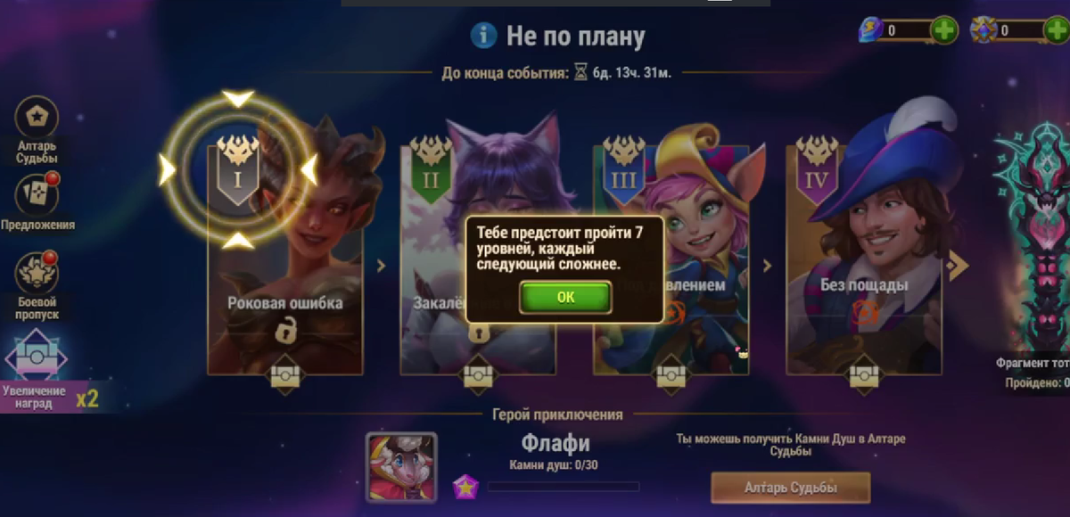 Всем привет. И вот мы дождались новый инвент. У нас есть шанс получить нового героя. А вернее героиню Флафи. Это овечка, да не просто овца. Но, всё по порядку. Заходим в портал. Тут же в нём собираю ежедневную награду и ежедневный заряд. И вперёд к приключениям. А значит знакомиться с историей новой героини. Желающие могут присоединится к видео и посмотреть всё сами. У нас здесь некий комикс, а по видео прохождение данного уровня. Ну вперёд, стрелочкой по карте, мчим. Орион и главную героиню, нам прикрепляет игра, в обязательном порядке. Ну, а дальше собираю свою команду. А вот и начало всей истории. Здесь то мы и видим тех, кто хочет принести в жертву нашу героиню. Несуразная такая героиня. Но, вот как только Малхаир начинает читать заклинание и уже дочитывает до конца, появляются герои. И всё пошло не так. Но пока они этого не понимают. Вот, команда собрана. Проходит бой героев и тех, кто проводил ритуал. И начало побед открыто в данном этапе. Бои продолжаются, вперемешку с историей
