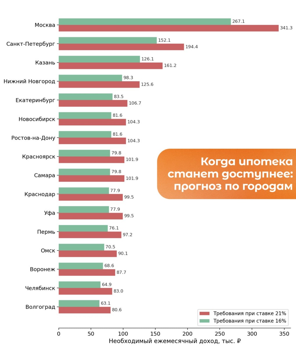 Если прогноз Минфина сработает и ставка по рыночной ипотеке опустится с ≈21% до ≈16% к концу года, банки начнут требовать меньший официальный доход — и это реально облегчает доступ к кредиту 📉 Что важно знать: 🤩 В среднем по крупным городам сейчас нужно ≈123,2 тыс. ₽/мес, при снижении ставки хватит ≈96,5 тыс. ₽ 💡 🤩 Сейчас в 9 из 16 мегаполисов порог для одобрения ипотеки на однушку ≥100 тыс. ₽, по прогнозу к концу года таких останется только три — Москва, Санкт-Петербург и Казань 😕 🤩 В ряде городов пороги опустятся до 80–100 тыс. ₽ (Н. Новгород, Екатеринбург, Новосибирск, Ростов), а в некоторых — до 63–70 тыс. ₽ (Воронеж, Челябинск, Волгоград) 👛 🤩 Конкретно по Краснодару: сейчас для одобрения потребуется примерно 99,5 тыс. ₽/мес, к концу года прогноз — ≈77,9 тыс. ₽/мес ☀️ Условия расчёта: однокомнатная квартира 35 м², первоначальный взнос 20%, сравнение ставок 21% vs 16% 📐 💭 Сейчас ещё можно оформить ипотеку с комфортными платежами — пишите в бот @grechka_nedvizhka_bot