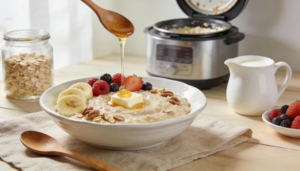 И тут я вспомнила про мультиварку, которая полгода пылилась в шкафу. Овсяная каша в мультиварке — это просто волшебство ! Засыпал хлопья, залил молоком, нажал кнопку — и пошёл собираться. Через 20 минут каша готова: нежная, кремовая, ароматная.