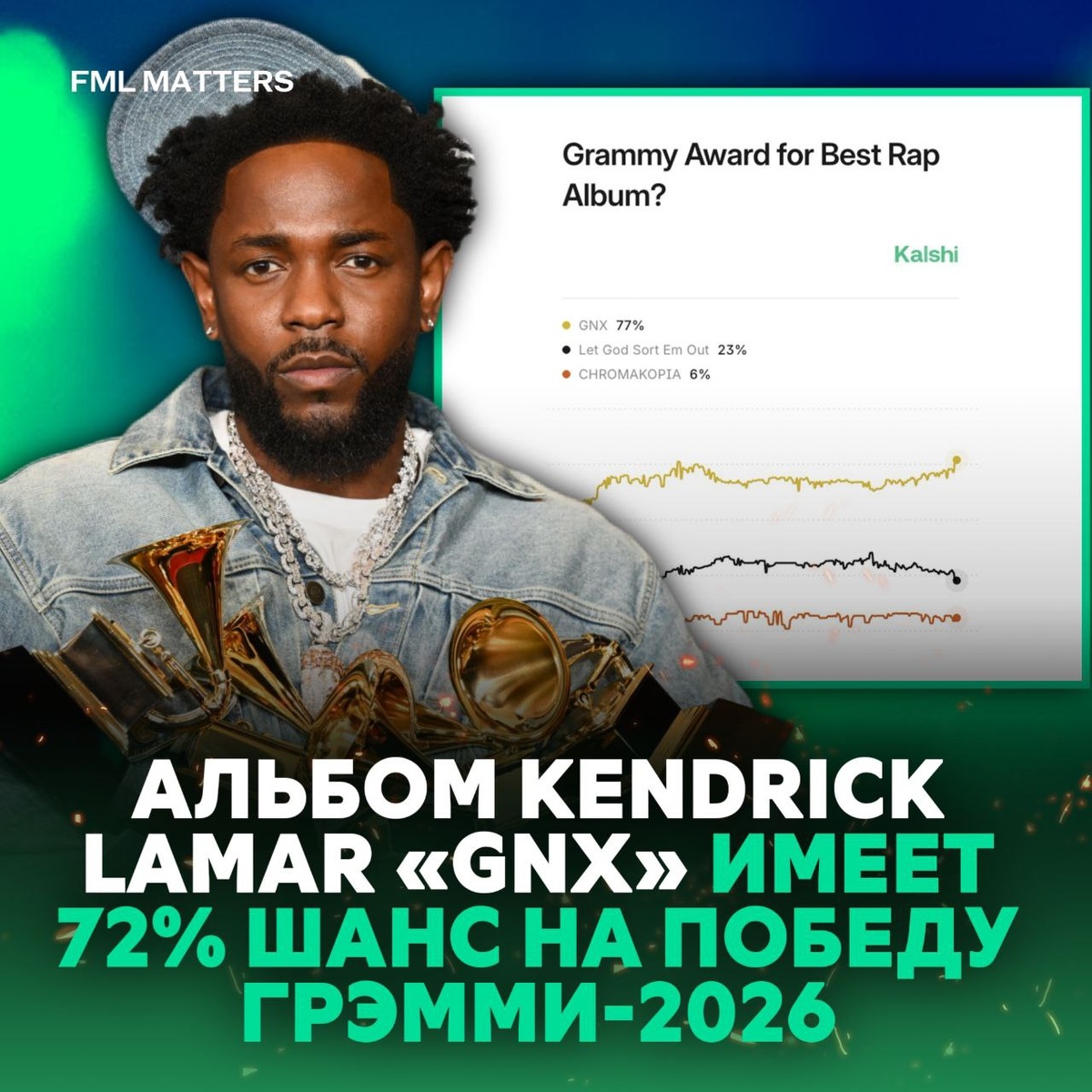 ! Согласно данным рынков Kalshi, альбом Кендрика Ламара «GNX» имеет 72% шанс на победу в номинации «Лучший рэп-альбом» на грядущих Грэмми-2026 года. ➖ Kendrick Lamar — «GNX»: 72% шанс ➖ Clipse — «Let God Sort Em Out»: 26% шанс ➖ Tyler, The Creator — «CHROMAKOPIA»: 7% шанс Заберёт? ❤️🔥 / 👎 💀 FML MATTERS