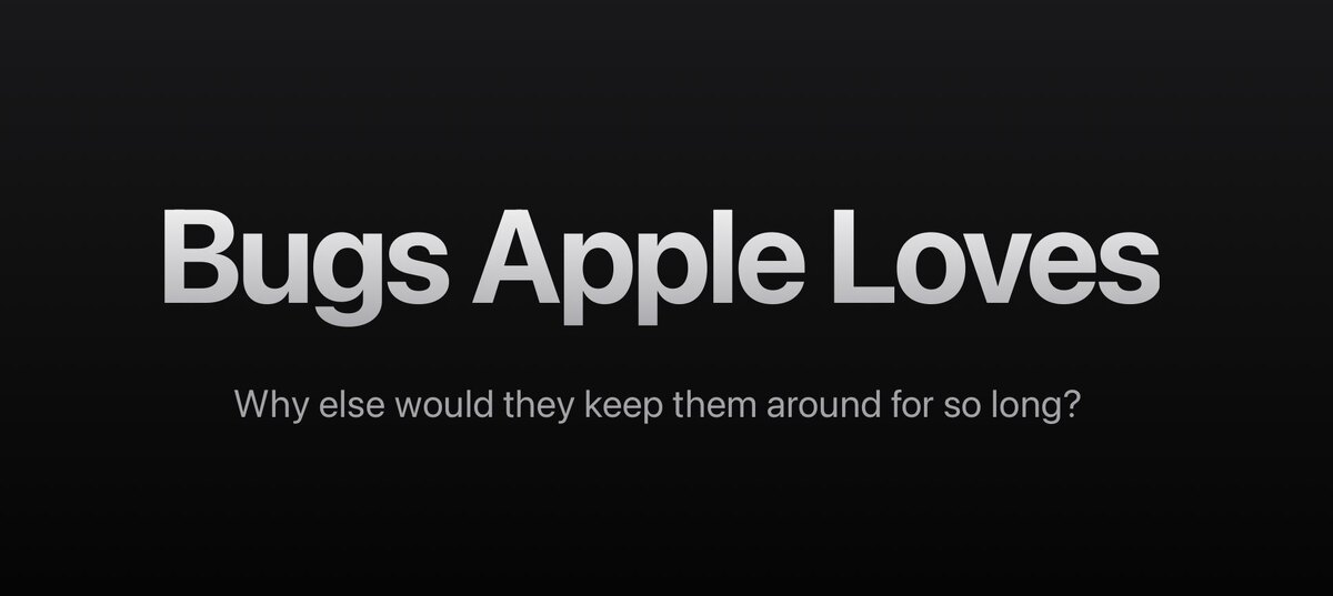 https://www.bugsappleloves.com Сайт собрал известные баги в экосистеме Apple. Подсчитали какой и где встречается и главное сколько лет и денег потеряли пользователи сталкиваясь с этими багами. Суммы конечно условны, но ОБЩЕЕ ВРЕМЯ, ПОТРАЧЕННОЕ ЧЕЛОВЕЧЕСТВОМ, ПОТОМУ ЧТО APPLE НЕ ИСПРАВИТ ЭТО - 32,1 миллиона лет