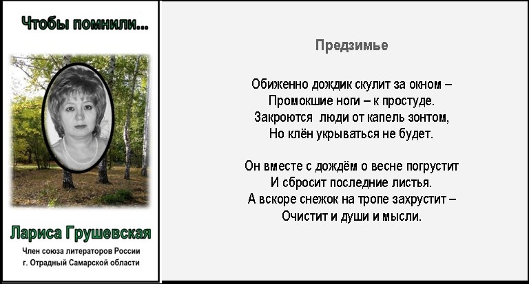 Вот и подумала я сегодня: А дай-ка я буду вставлять по паре стихотворений в свои публикации. Они много места не займут, значит и не станет дзен выеживаться) Сегодня - стихи моей рано ушедшей подруги. Прошло восемь лет, а ее место в моем сердце так и осталось пустым... Лариса Грушевская Сейчас, когда шагренью сжалась жизнь,