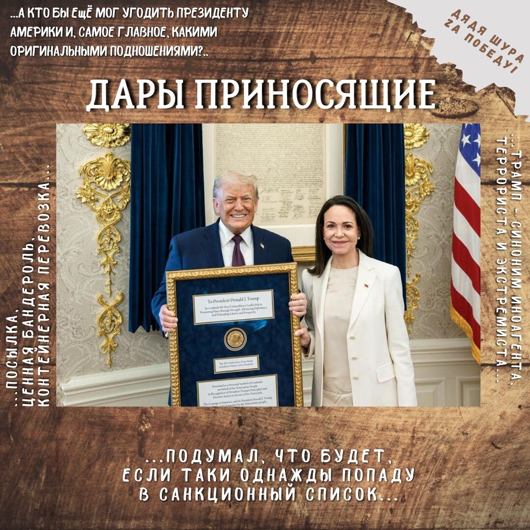 Лидер венесуэльской оппозиции Мария Корина Мачадо отдала присуждённую ей Нобелевскую премию мира Дональду Трампу. Такой политический жест с одной стороны напоминает флешмоб, а с другой звонко перекликается с временами до нашей эры, когда римским патрициям приносили дары люди статусом ниже, дабы понравиться представителю знати.