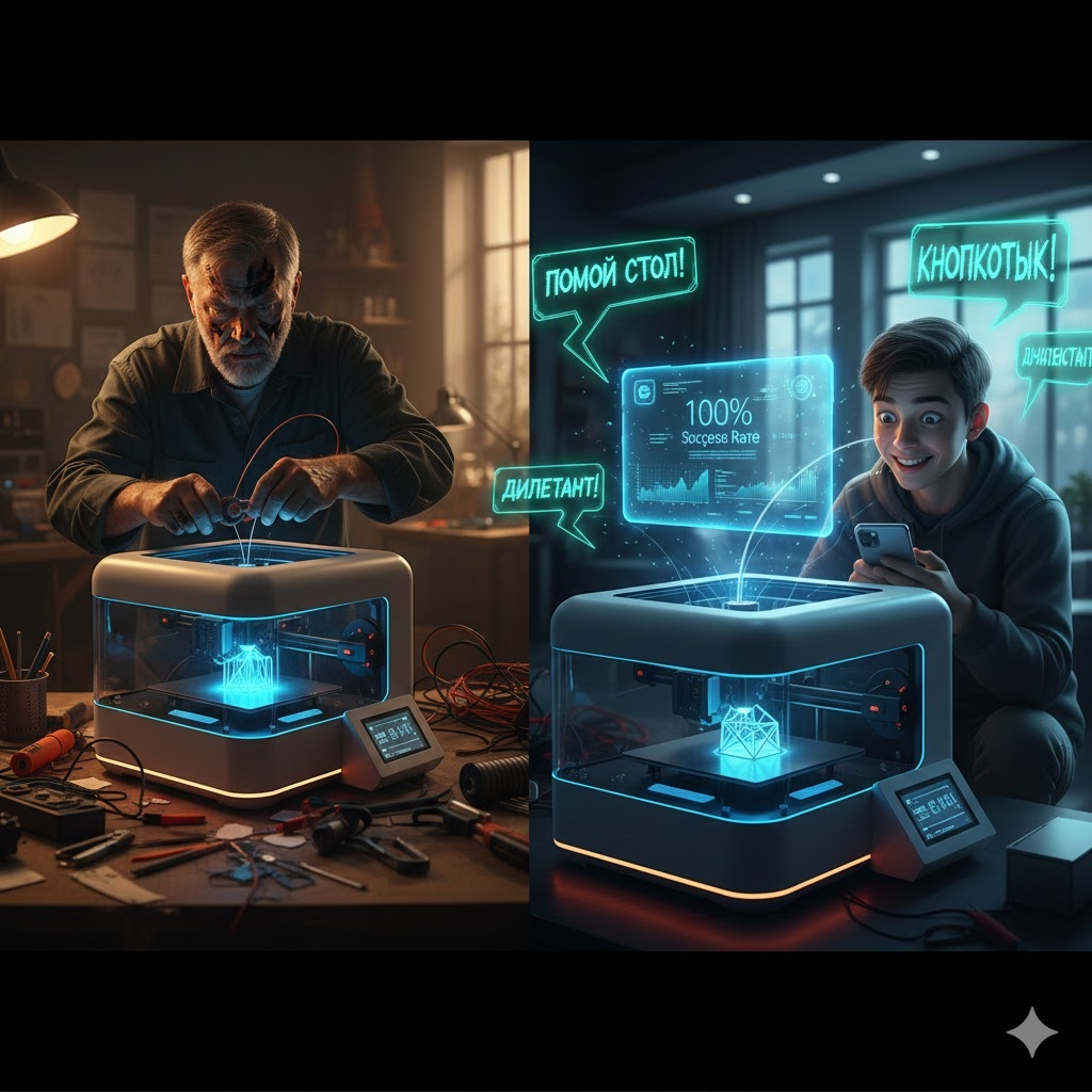 Главный конфликт 2026 года — это столкновение двух миров. С одной стороны — «старички», которые собирали свои первые принтеры из палок, желудей и прошивки Marlin, сжигая пальцы о горячие сопла. Для них 3D-печать — это страдание и путь самурая.