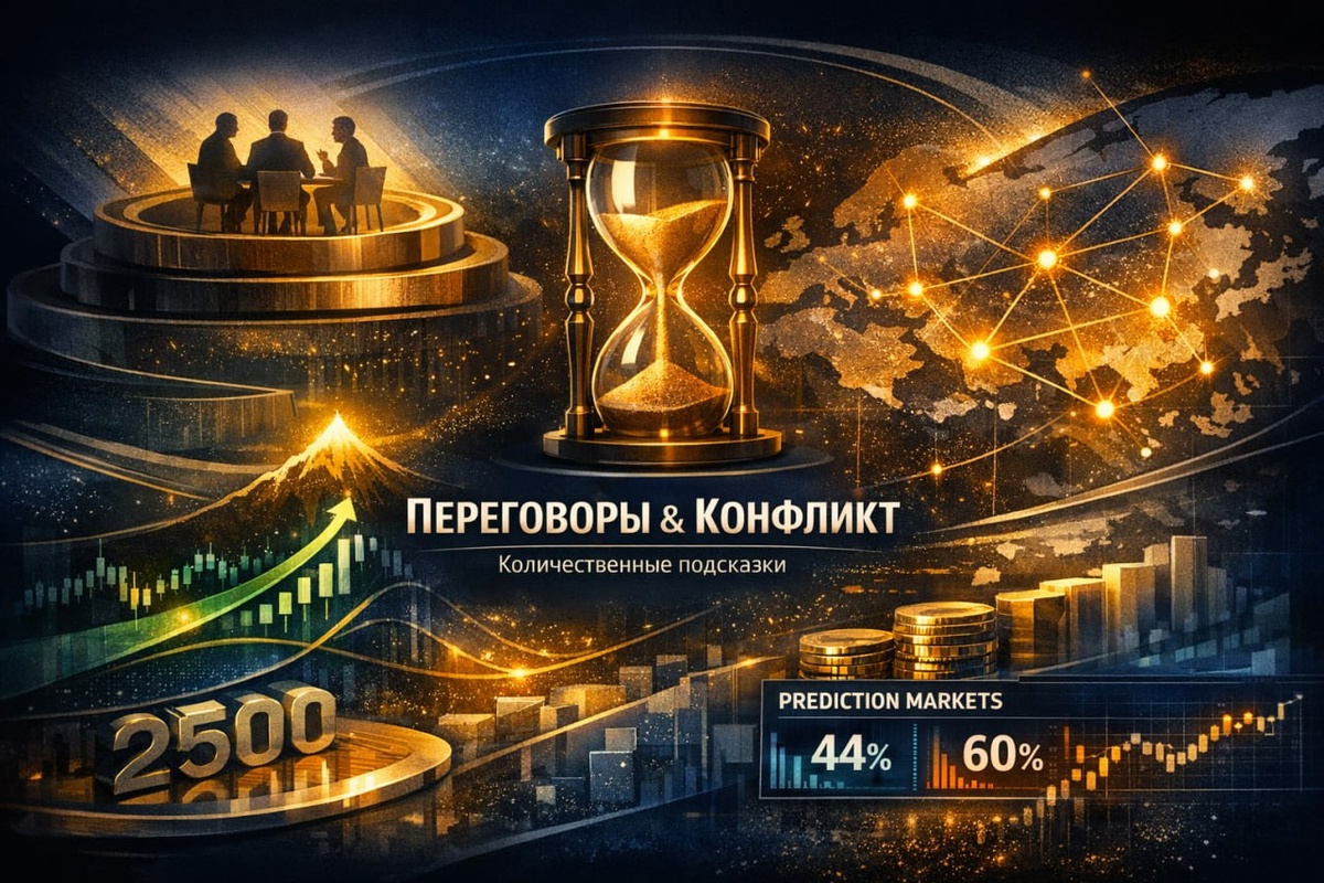 Всем привет, на связи Эван! Знаете, вот есть в США индекс загрузки пиццерий вокруг Пентагона, мол так можно понять, что идет ночная работа и может быть какая-то заварушка… Посмею переложить это на сегодняшнюю Москву, которая особенно перекрыта, замерла в пробках, а точка в навигаторе не то что летает… он просто не показывает, где ты находишься. Определенно идет важная работа на фоне визита Уиткоффа в Москву и старта раунда переговоров в Абу-Даби. На этом моменте я могу прозвучать как сторонник теорий заговора и фантазий? Поэтому именно тут я предлагаю свернуть к «Количественным подсказкам». Что числа говорят о происходящих процессах? 1. Начну с Prediction Markets (дают возможность посмотреть распределение вероятностей события, на которое поставили деньги). Сейчас вероятность остановки огня оценивают в 44% до конца года. Момент для опытных. В рынке «Что произойдет до выхода GTA 6» есть вариант с остановкой огня, и у него вероятность 60%… Эти 44% говорят о том, что пока толпа или прибли
