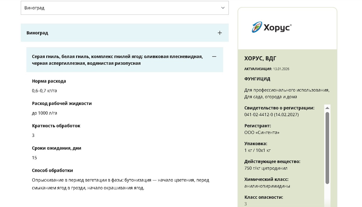 ВАЖНО! Срок ожидания Хоруса на винограде в прошлом году при тех же концентрациях изменён с 7 дней до 15 дней. В прошлогодней таблице Схема 2025 стоит срок ожидания 7 дней, т.к. она была опубликована в декабре 2024 года и тогда срок был именно такой.