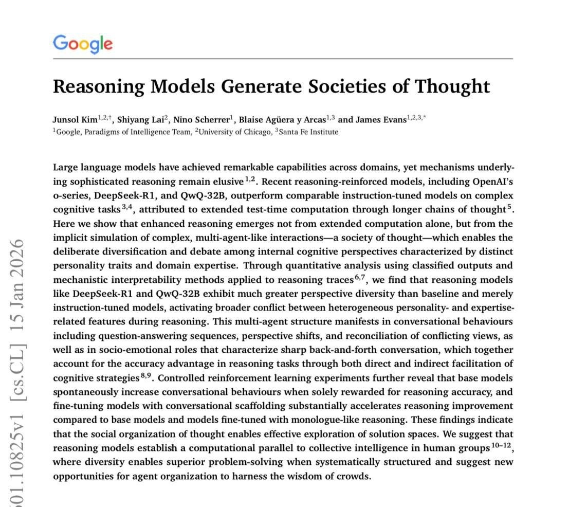 » Исследователи Google обнаружили необычный феномен в продвинутых reasoning-моделях. Они становятся умнее не только благодаря объёму вычислений или параметров, а потому, что начинают имитировать внутреннюю «команду экспертов». В чём суть? Модель не просто «размышляет» — она самостоятельно разыгрывает мульти-агентный процесс. Внутри неё возникают разные точки зрения, которые: 🔺 Предлагают идеи и гипотезы, как отдельные роли (например, «следователь», «скептик», «креативщик»). 🔺 Спорят между собой, проверяя аргументы на прочность. 🔺 Сходятся на оптимальном решении через мини-дебаты. Это похоже на мозговой штурм, где каждый «агент» защищает свою позицию, а модель сводит всё к лучшему выводу. Именно внутренние дебаты помогают таким моделям эффективнее решать сложные многоступенчатые задачи, требующие критической проверки и взвешенных решений. Исследование подтверждает: настоящая «рассуждающая» ИИ-система — это не просто мощный вычислитель, а внутренний совещательный механизм, умеющ